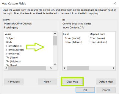 In the dialog box, drag and drop the fields on the left to the right: ‘From: (Name)’ > ‘Name’ and ‘From: (Address)’ > ‘E-mail’.
