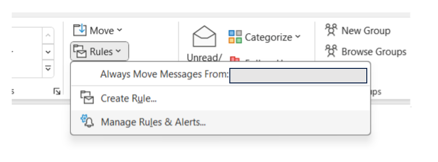 Step 2: Press Rules, then select the Manage Rules & Alerts option from the Rules drop-down.
