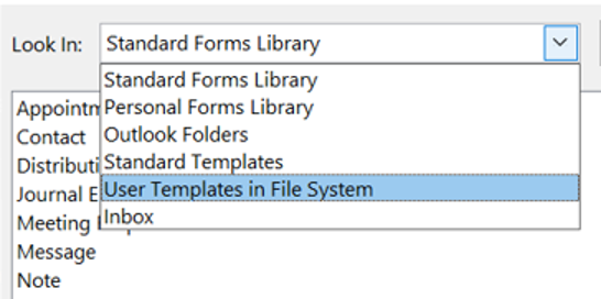 Step 3: The Choose Form dialog box will appear. Click on the Look In drop down arrow, and then User Templates in File System.