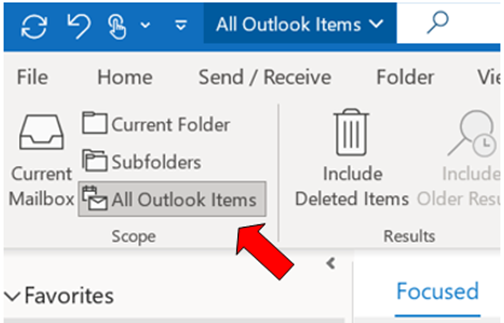 Step 1: Enter a keyword from the email you remember in the Outlook Instant Search bar. It is important to select All Outlook Items.