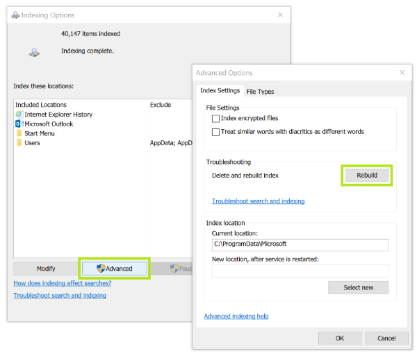 This will completely rebuild your entire search index from scratch – Windows and Outlook files included. This is another process that may take some time and cause your computer to run slowly. Depending on the number and size of the files that need to be re-indexed, it can take from a couple of minutes to a few hours. Try running the index rebuilding process overnight.