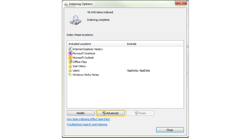 4. Once the Indexing Options Dialog Box opens, select Advanced. You’ll need to have administration rights to access this.