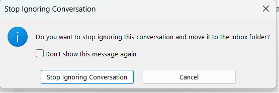 Step 4: A pop-up window will ask you to confirm that you want to stop ignoring the conversation. Click Ok.