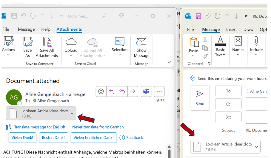 When replying to an email, attachments may not automatically be included. However, you have the option to simply copy and paste them into the forwarding mail.