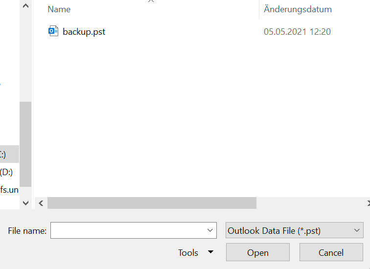 Step 3: Choose the desired file in the register. Finally, confirm your choice by clicking Open. Outlook will then open your PST file.