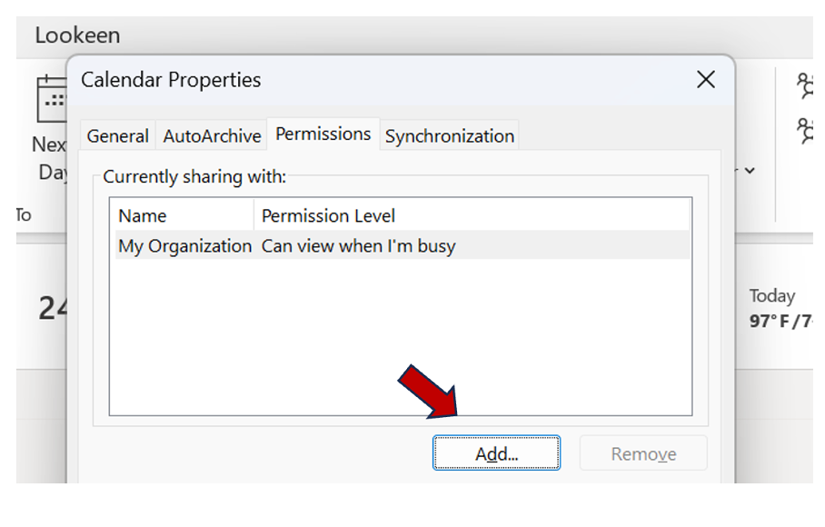 Step 3: In the appearing “Calendar Properties dialog box” you can add the users you want to grant access to your calendar. Simply press “Add” and select accordingly from your contact list.