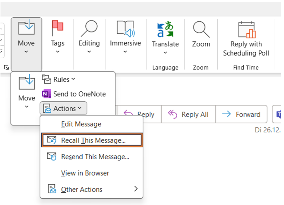 Step 3: Once you open the email, head to the Message tab and select Actions. A menu will drop-down and you will then have to select the Recall This Message option.