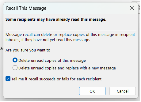 Step 4: Two options will appear, “Delete unread copies of this message” and “Delete unread copies and replace with a new message”. Select which option applies to your situation and then click OK.