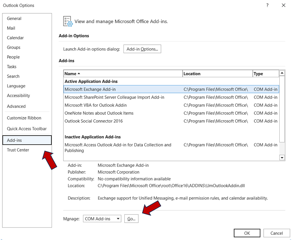 Step 4: Click “COM Add-ins”, then click on the “Go…” button.
