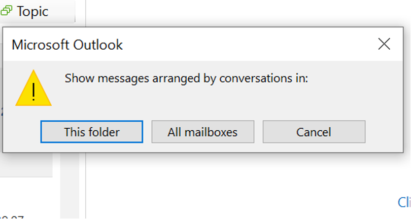 Step 3: To enable the conversation view for one folder only, select “This folder”. Alternatively, if you want to view all your Outlook folders as conversations, select “All mailboxes”.