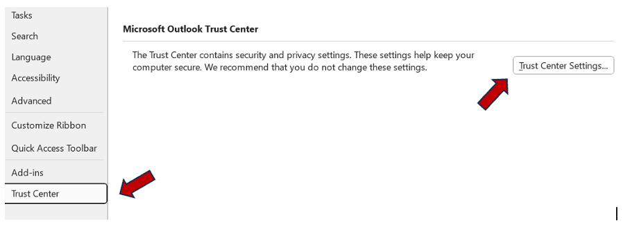 Step 2: On the left in the pop-up window, select “Trust Center”, then “Trust Center Settings” on the right.
