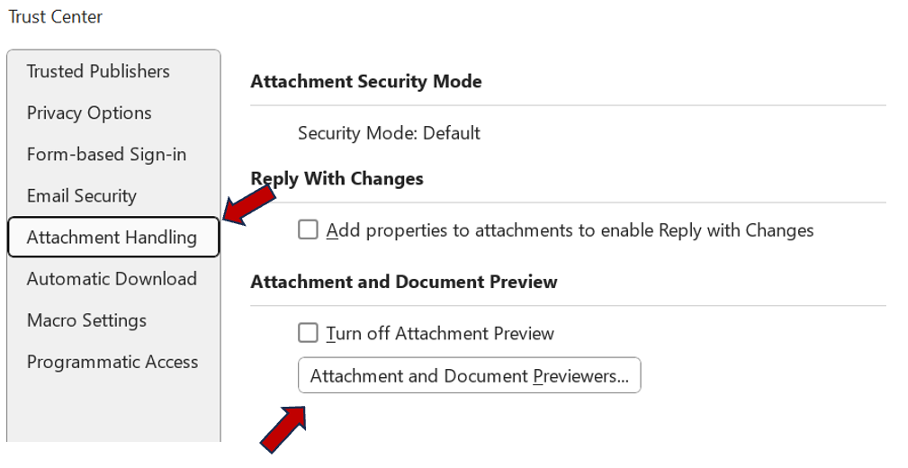 Step 3: Uncheck “Turn Off Attachment Preview”. Then, click on “Attachment and Document Previewers” and double-check that all files are active.
